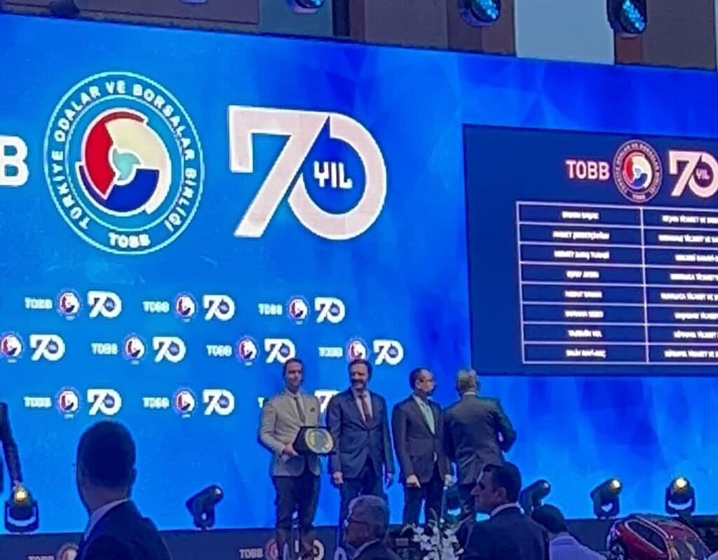Ticaret Bakanımız Sayın Dr. Mehmet Muş’un da katıldığı TOBB 70. Yıl etkinliklerinde TOBB Başkanımız Sayın M. Rifat Hisarcıklıoğlu tarafından Genel Sekreterimiz Erdem Başak’a Hizmet Şeref Belgesi ve Plaket takdimi yapıldı.